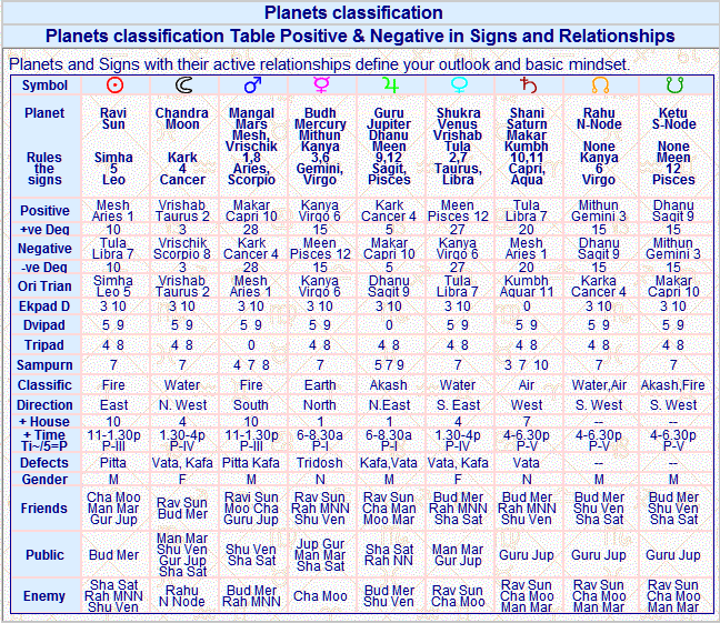 --Planets Clsssification Table With Positive, Negative and Relationship--